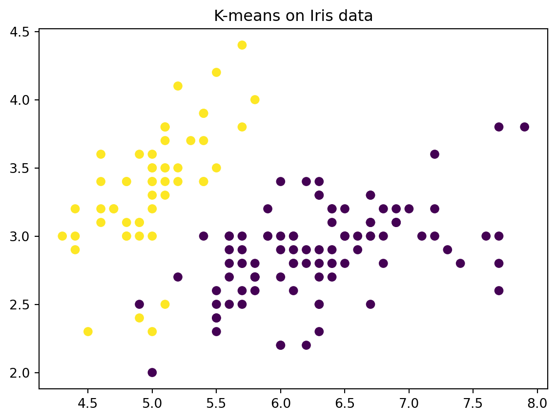 # Perform k means with k = 2kmeans = KMeans(n_clusters=2, random_state=2, n_init=20)kmeans.fit(X)# The cluster assignments of the observations are contained in kmeans.labels_kmeans.labels_# Plot the data, with each observation colored according to its cluster assignment.plt.figure()plt.scatter(X[:,0], X[:,1], c=kmeans.labels_)plt.title("K-means on Iris data")plt.show()