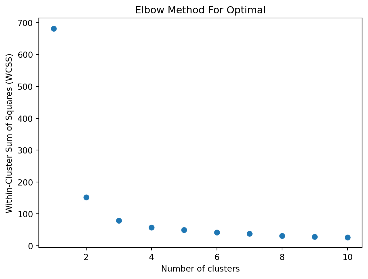 import numpy as npimport matplotlib.pyplot as pltfrom sklearn.cluster import KMeansfrom sklearn.datasets import load_iris# Load datairis = load_iris()X = iris.data# Plot WCSS (inertia) as a function of the number of clusterswcss = []# try a few different values of kk_range =range(1,11)for k_var in k_range:# fit kmeans kmeans = KMeans(n_clusters=k_var, random_state=2) kmeans.fit(X)# append WCSS to a list wcss.append(kmeans.inertia_)# plotplt.figure()plt.scatter( k_range , wcss )plt.xlabel('Number of clusters')plt.ylabel('Within-Cluster Sum of Squares (WCSS)')plt.title('Elbow Method For Optimal')plt.show()