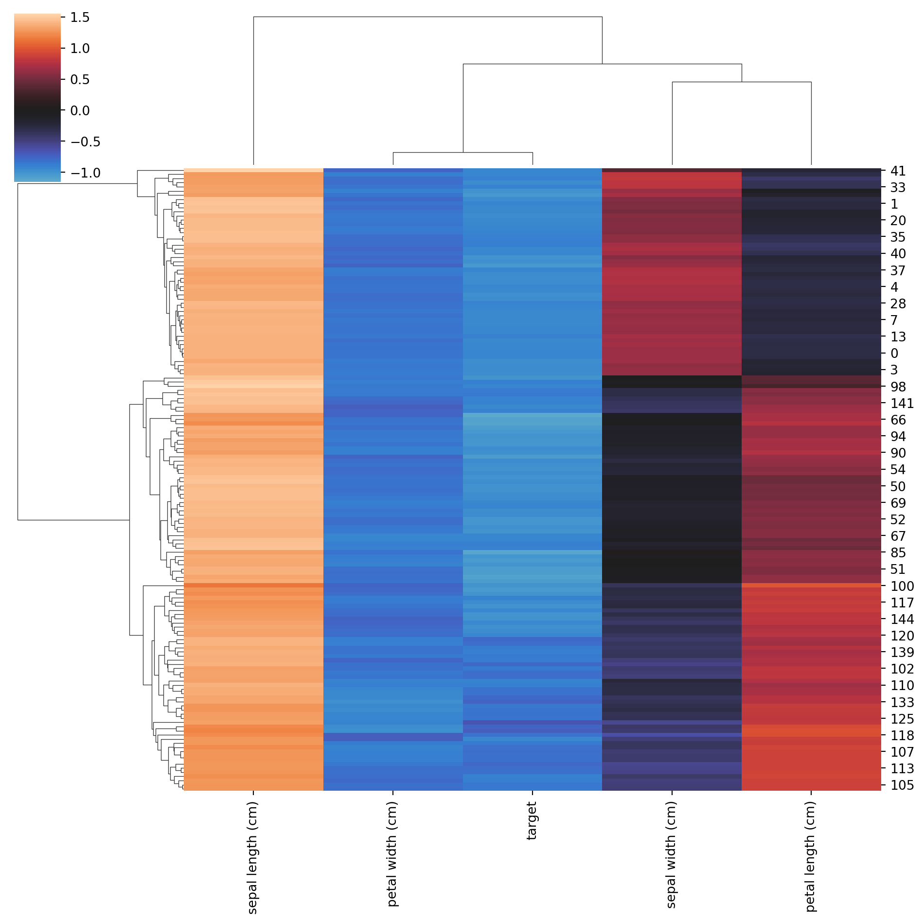 import seaborn as snssns.clustermap(X, method='average', metric='correlation', z_score =0, center=0)