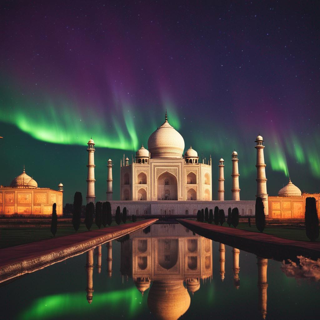 Taj Mahal bathed in the Northern Lights. Generated using the DALL-E tool.