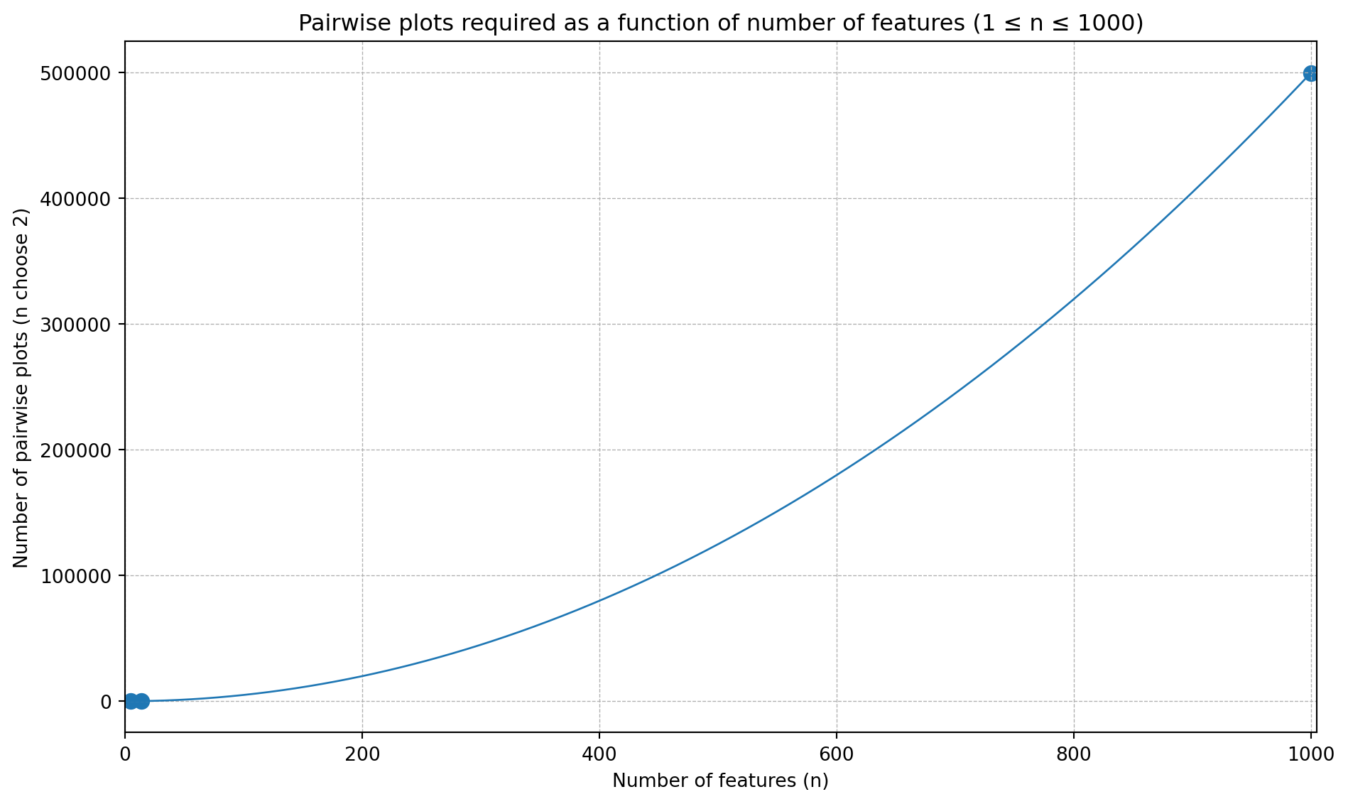 Would you plot each feature/column vs the other exhaustively? How many pairwise plots would you need to plot for exhaustive visualization?