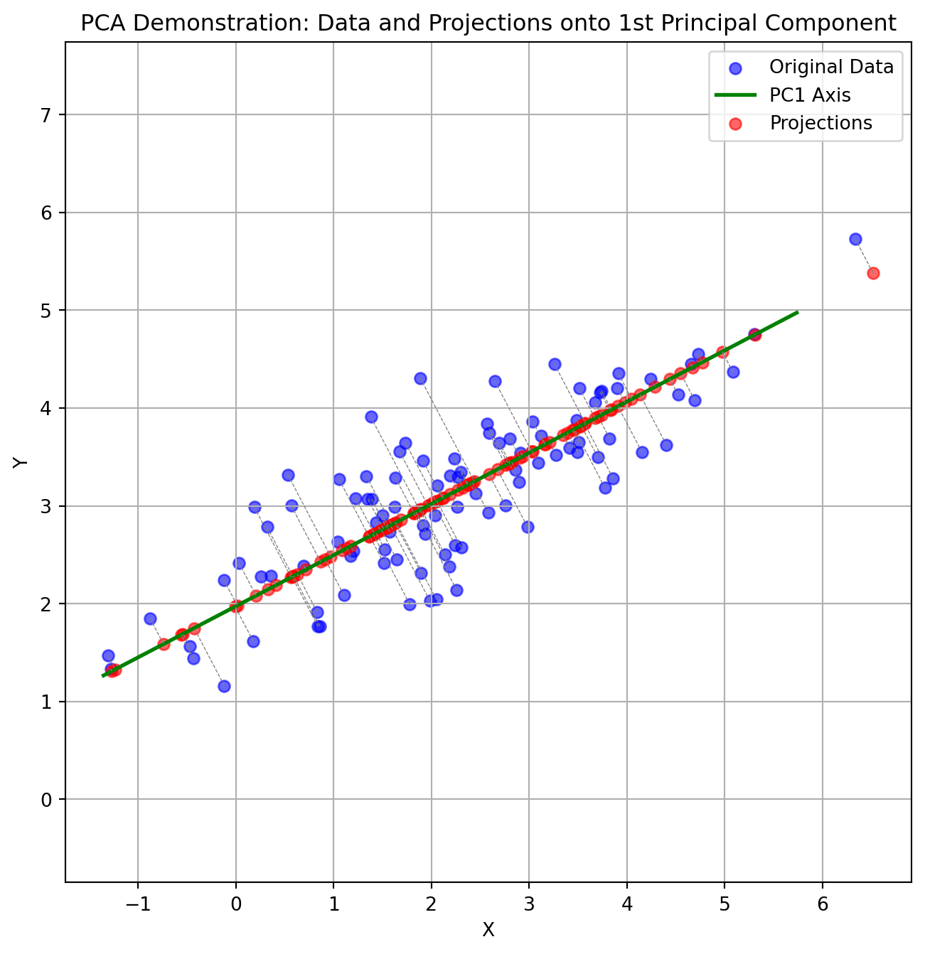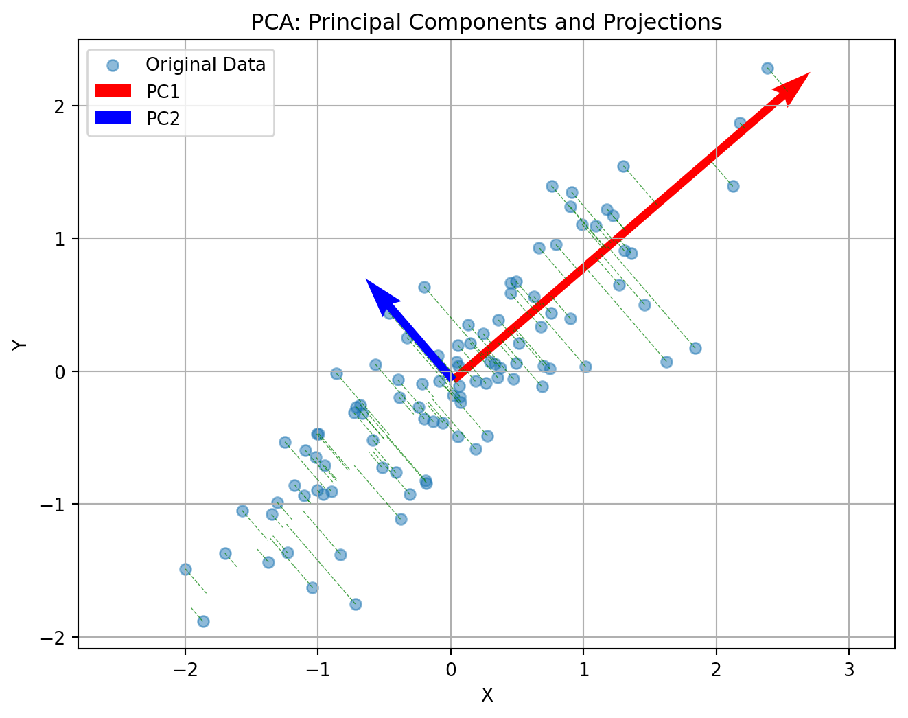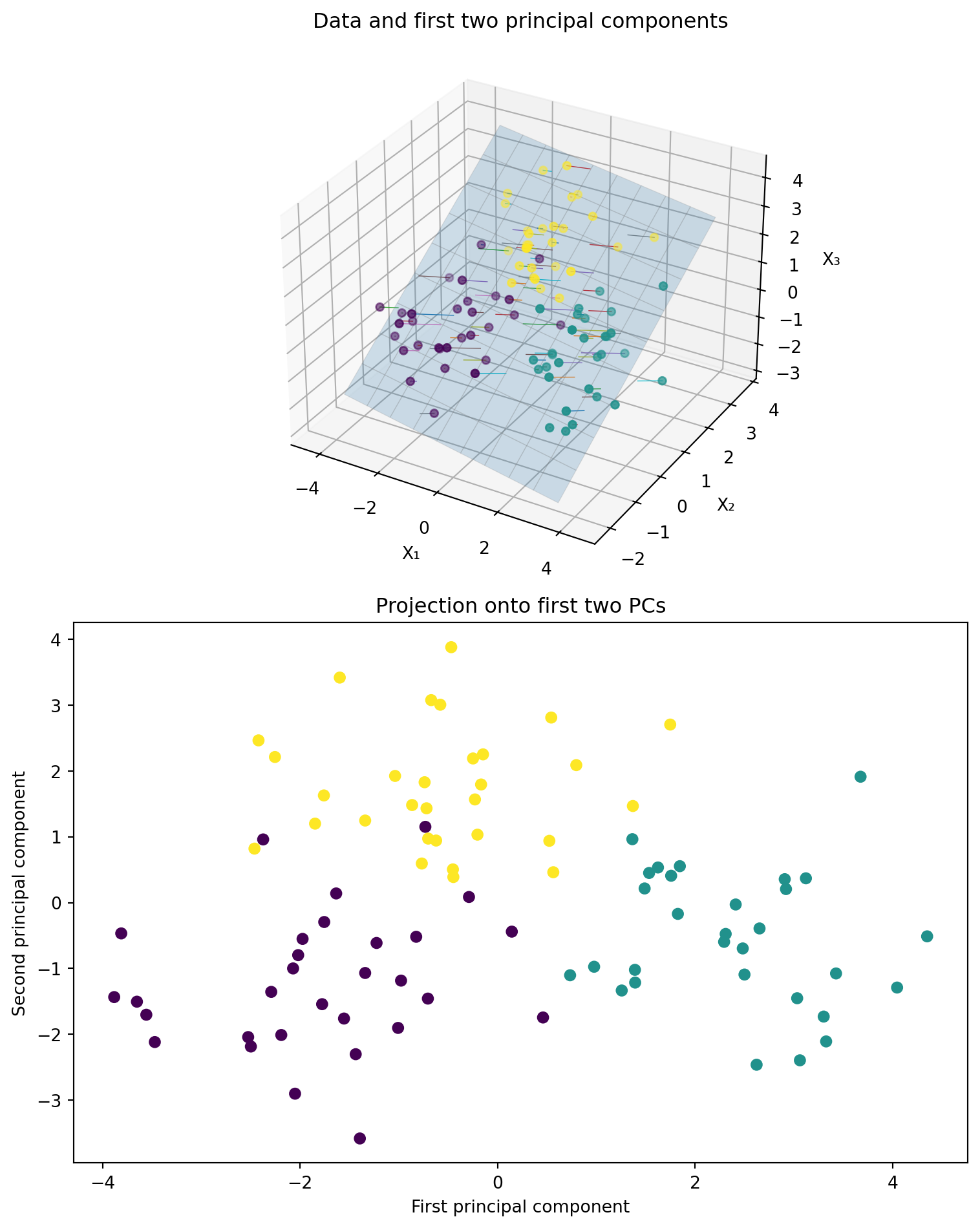 - Left panel: A 3D scatter of the original points, the best‐fit plane defined by the first two principal components, and projection lines from each point down onto that plane.