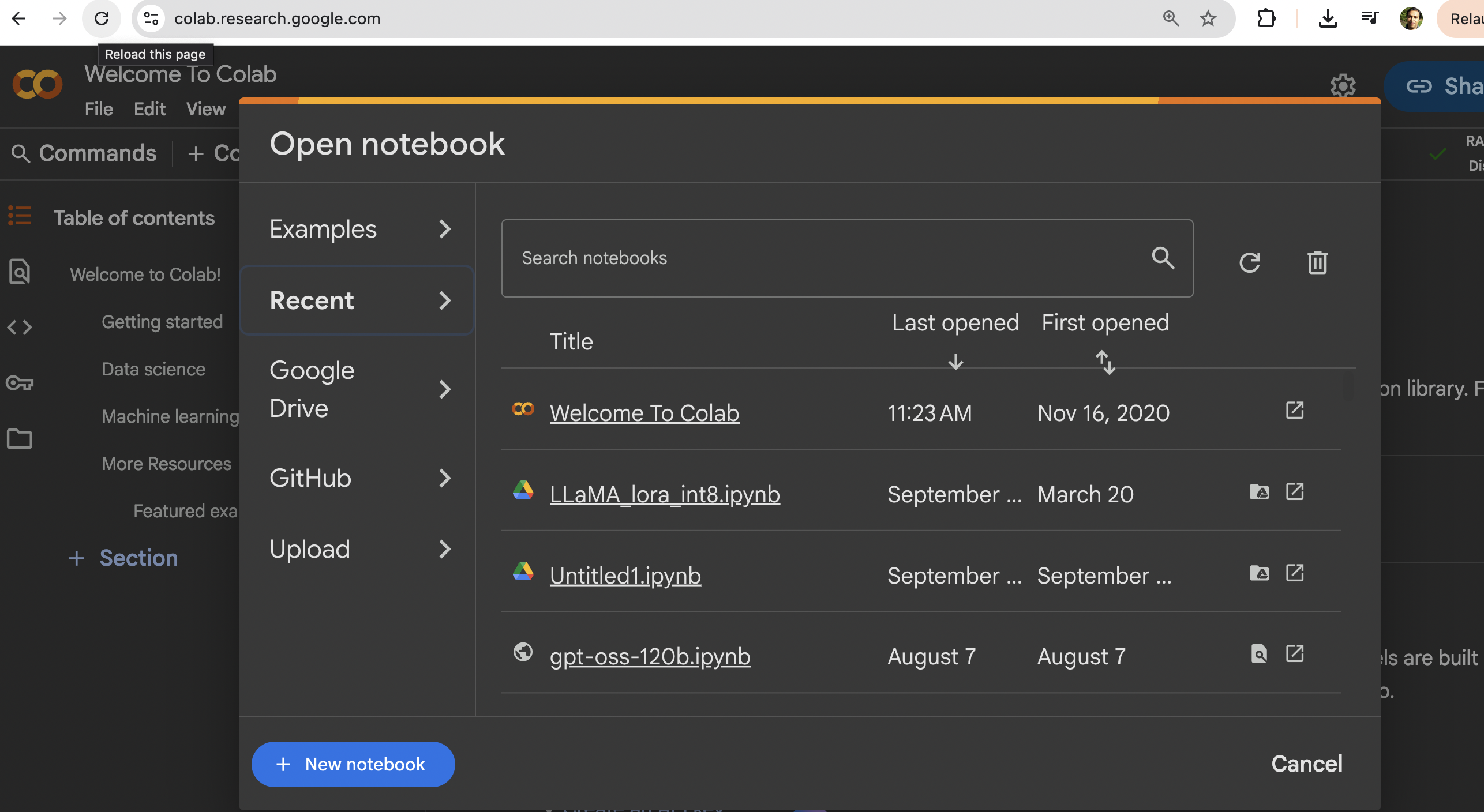 Open a new notebook in Google Colab